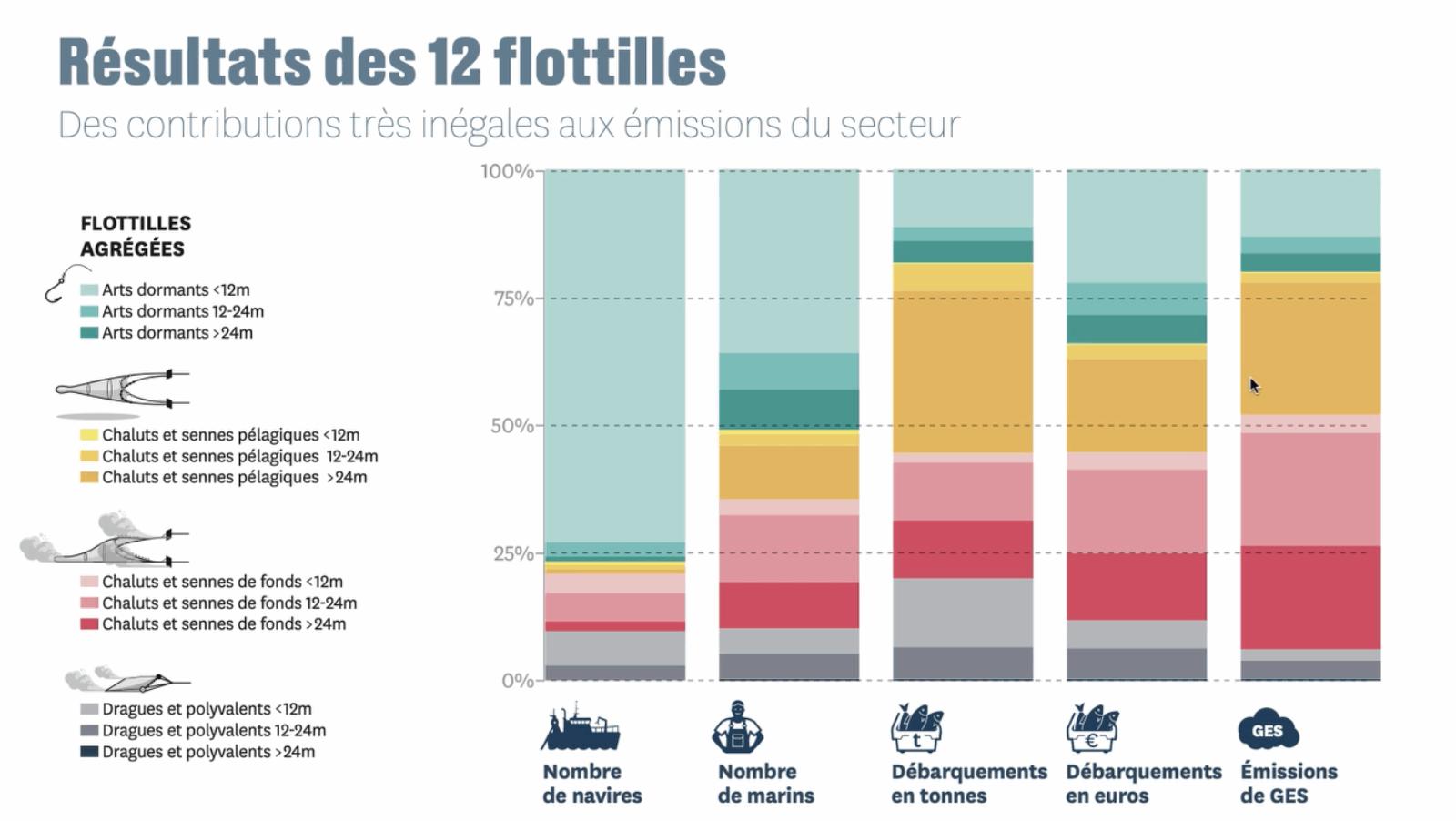 La comptabilisation des émissions des gaz à effets de serre qui vous est présentée ici couvre la partie productive du secteur de la pêche, soit l’ensemble des émissions générées depuis la construction des navires de pêche jusqu’à leur retour à quai, à l’exclusion de la transformation et la distribution des produits pêchés. Elle constitue la première tentative à l’échelle nationale de quantification des émissions de gaz à effet de serre associées à l’activité de pêche professionnelle.