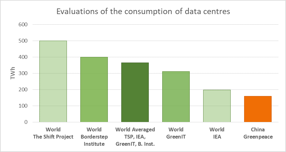 Comparaisons des estimations de la consommation des centres de données dans le monde, en Chine et Europe en 2018, selon plusieurs études. Sources : The Shift Project, IEA, GreenIT.fr, Greenpeace East Asia, Borderstep Institute.