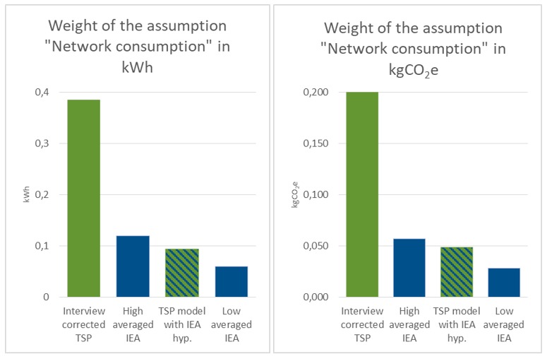 2/ Restent 10 % des écarts constatés (l’écart entre les deux évaluations une fois l’erreur de bitrate corrigée, soit un écart de 0,143 à 0,172 kgCO2e), qui sont dus principalement à des différences d’hypothèses sur la consommation électrique des infrastructures réseaux (kWh/byte de données transféré). Ces hypothèses sont en effet responsables de la quasi-totalité des 10 % d’écart restant après correction du bitrate.