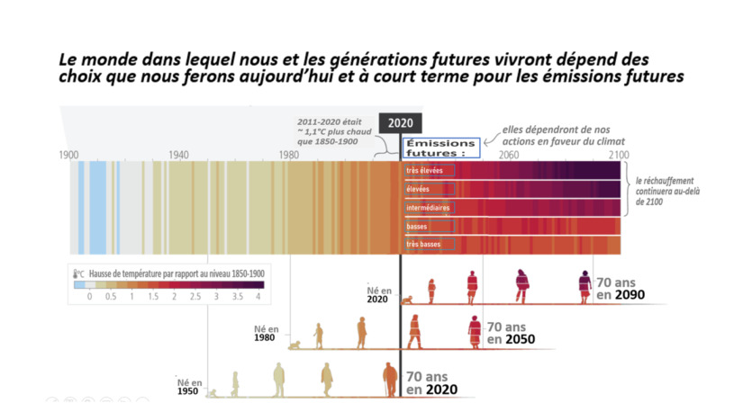 L’influence humaine sur le climat est aujourd’hui sans équivoque. Les années les plus chaudes que nous avons vécues jusqu’à présent seront parmi les plus fraîches d’ici une génération. Les émissions de GES passées ont engendré des changements profonds dans toutes les composantes du système climatique. La poursuite des émissions aggrave les impacts du changement climatique. De nombreux changements sont irréversibles sur des échelles de temps centennales à millénaires. Les choix et actions mis en œuvre au cours de la décennie en cours auront donc des répercussions aujourd’hui et pendant des milliers d’années.