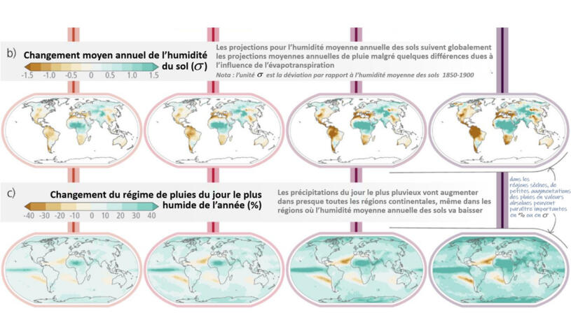 L’augmentation des températures mondiales entraîne une perturbation du cycle de l’eau, une intensification des fortes pluies (moussons par exemple) et une augmentation de la fréquence des périodes humides et sèches. Combinées aux canicules, ces dernières seront favorables aux incendies de forêt.  Les tempêtes seront partout plus fréquentes. Dans les océans, le changement climatique entraînera une élévation accrue du niveau des mers via le réchauffement des eaux et la fonte des glaciers et calottes polaires, ainsi qu’une baisse de la teneur en oxygène et une augmentation de l’acidité des eaux. Les puits naturels de carbone vont voir leur capacité d’absorption du CO2 diminuer, amplifiant d’autant le changement climatique.