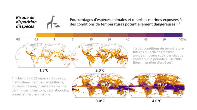 Chaque dixième de degré d’élévation des températures mondiales augmente les risques liés au changement climatique et rend leur gestion plus complexe. En effet, certains impacts vont se combiner et s’étendre à d’autres régions. Par exemple, le changement climatique va entraîner une baisse de la production de nourriture et la déstabilisation des chaînes de transport. Ce risque va potentiellement être amplifié par d’autres facteurs non climatiques tels que les conflits armés, les pandémies et les tensions liées au partage des ressources.