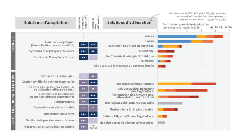 Des mesures d’atténuation drastiques et rapides et une mise en œuvre accélérée des mesures d’adaptation au cours de cette décennie permettraient de réduire les dégâts attendus sur les humains et les écosystèmes. Cela engendrerait de nombreux co-bénéfices, comme l’amélioration de la qualité de l’air, du bien-être et de la santé (mobilité active, régimes alimentaires sains et durables) ou de la productivité agricole. Au contraire, le report de ces mesures accentuerait le réchauffement planétaire, réduirait les capacités d’action (des systèmes humains et naturels atteindraient leurs limites d’adaptation) et augmenterait les dégâts.